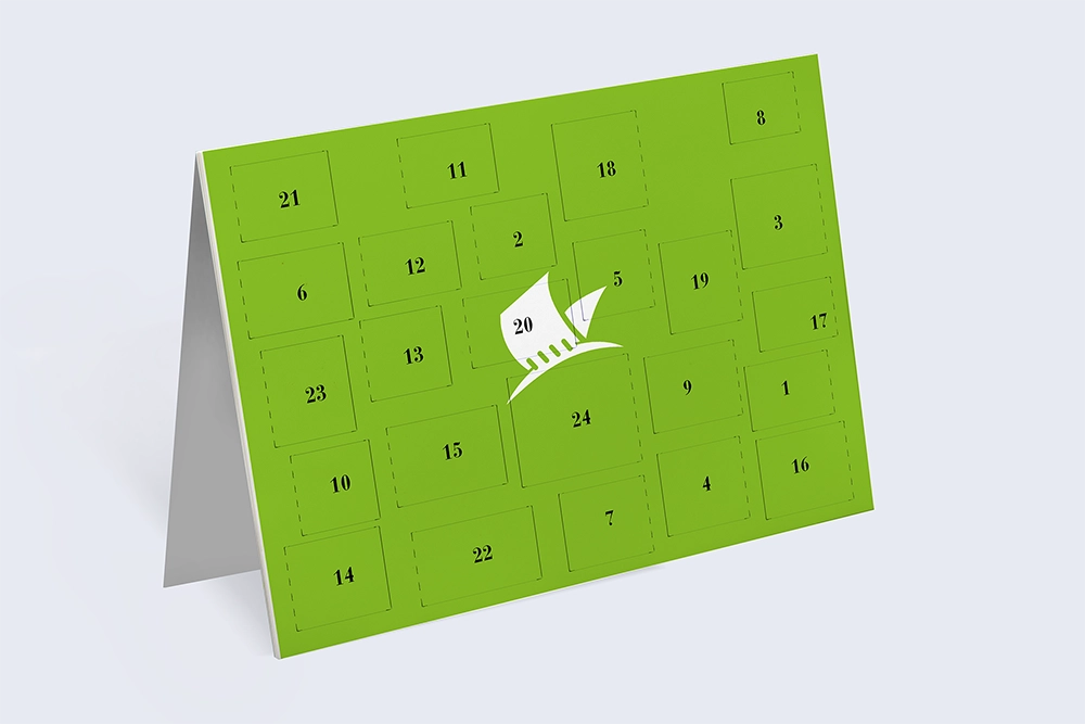 Steigern Sie die Vorfreude Ihrer Kunden – mit unserer Adventskalender-Grußkarte. Welche Motive Sie hinter den Türchen verstecken, entscheiden Sie. Die Klappkarte lässt sich rundum bedrucken.